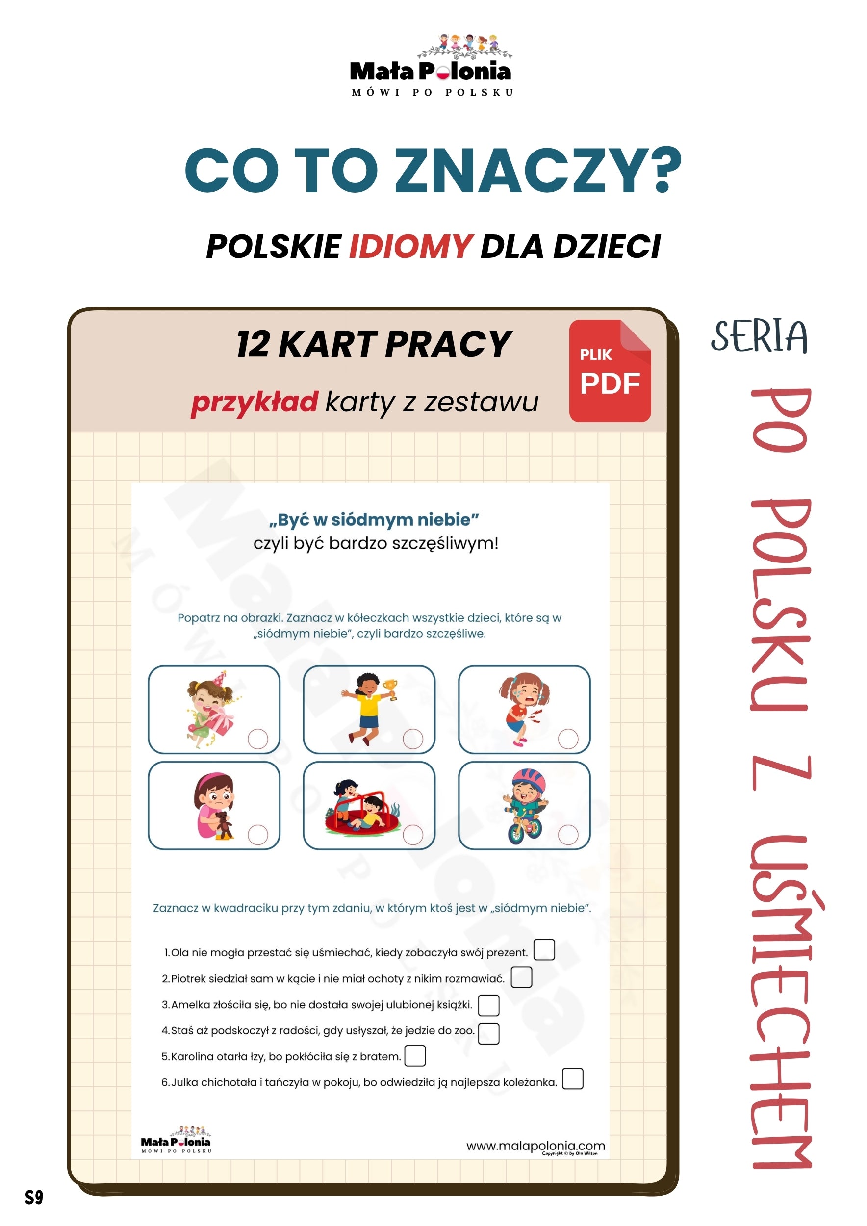 „Polskie idiomy dla dzieci – zestaw kart pracy” to komplet 12 kolorowych kart w formacie PDF, stworzonych z myślą o dzieciach w wieku wczesnoszkolnym, również tych uczących się języka polskiego za granicą.
